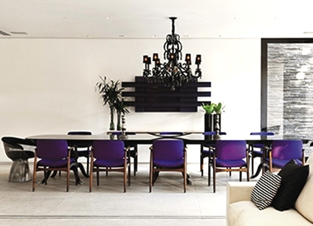 | Mesa de jantar com 12 poltronas com tecido roxo, são um luxo contemporâneo, o destaque para o Lustre negro clássico. |